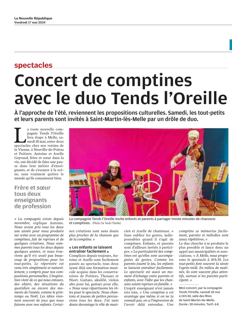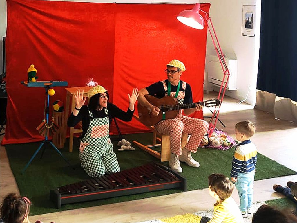 Antoine et Axelle sont frère et sœur sur scène et dans la vie. Depuis l’enfance, les chansons et les instruments rythment leur quotidien. Enseignants en école primaire depuis près de 15 ans, ils ont décidé de prendre le temps de créer ensemble une compagnie pour présenter leurs chansons au jeune public et continuer de partager avec les enfants la passion de la musique.